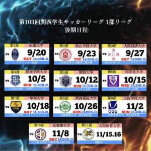第103回関西学生サッカーリーグ1部リーグ後期リーグの日程が決定致しましたので、ご報告させていだきます。